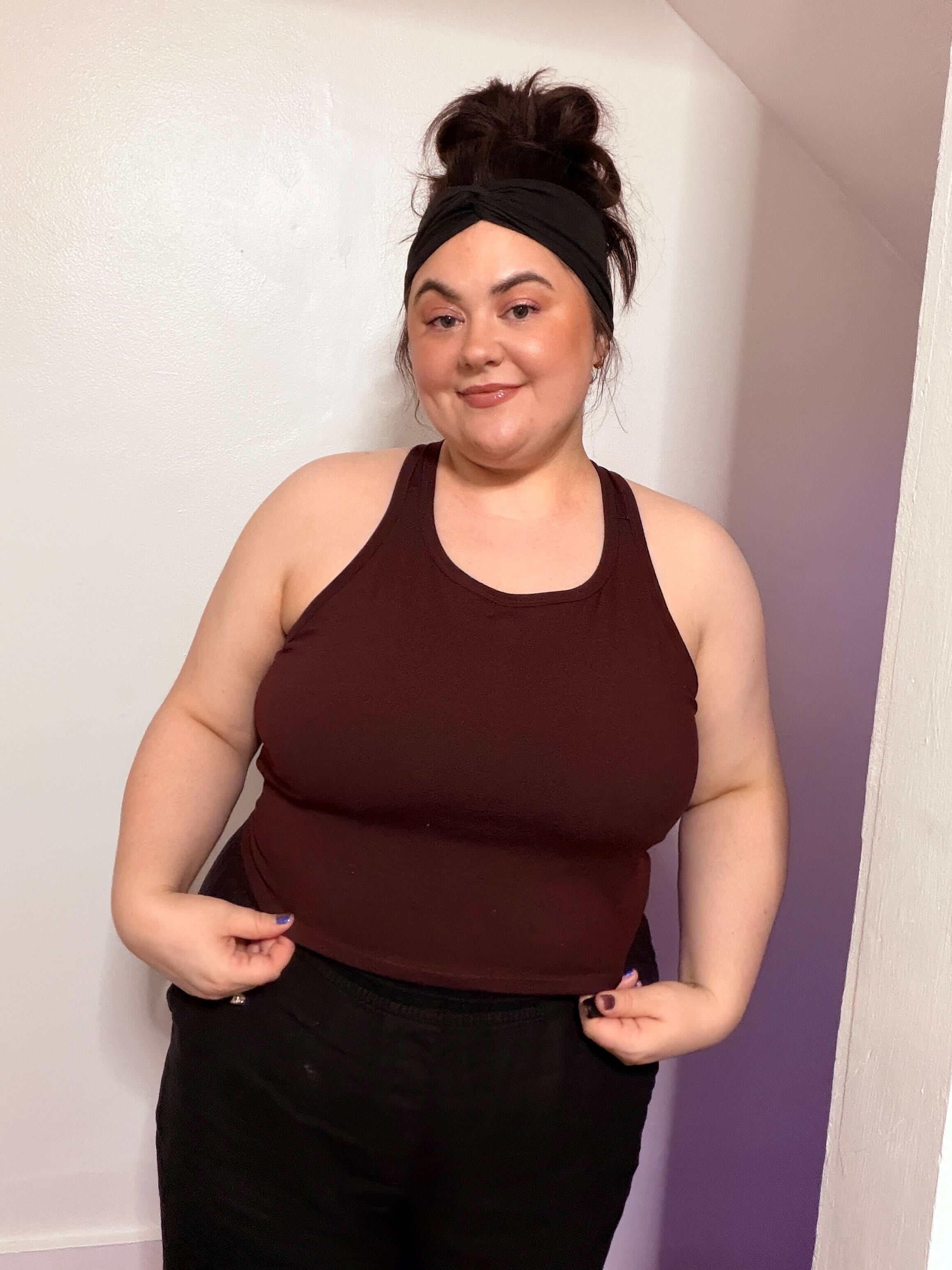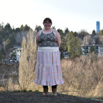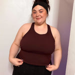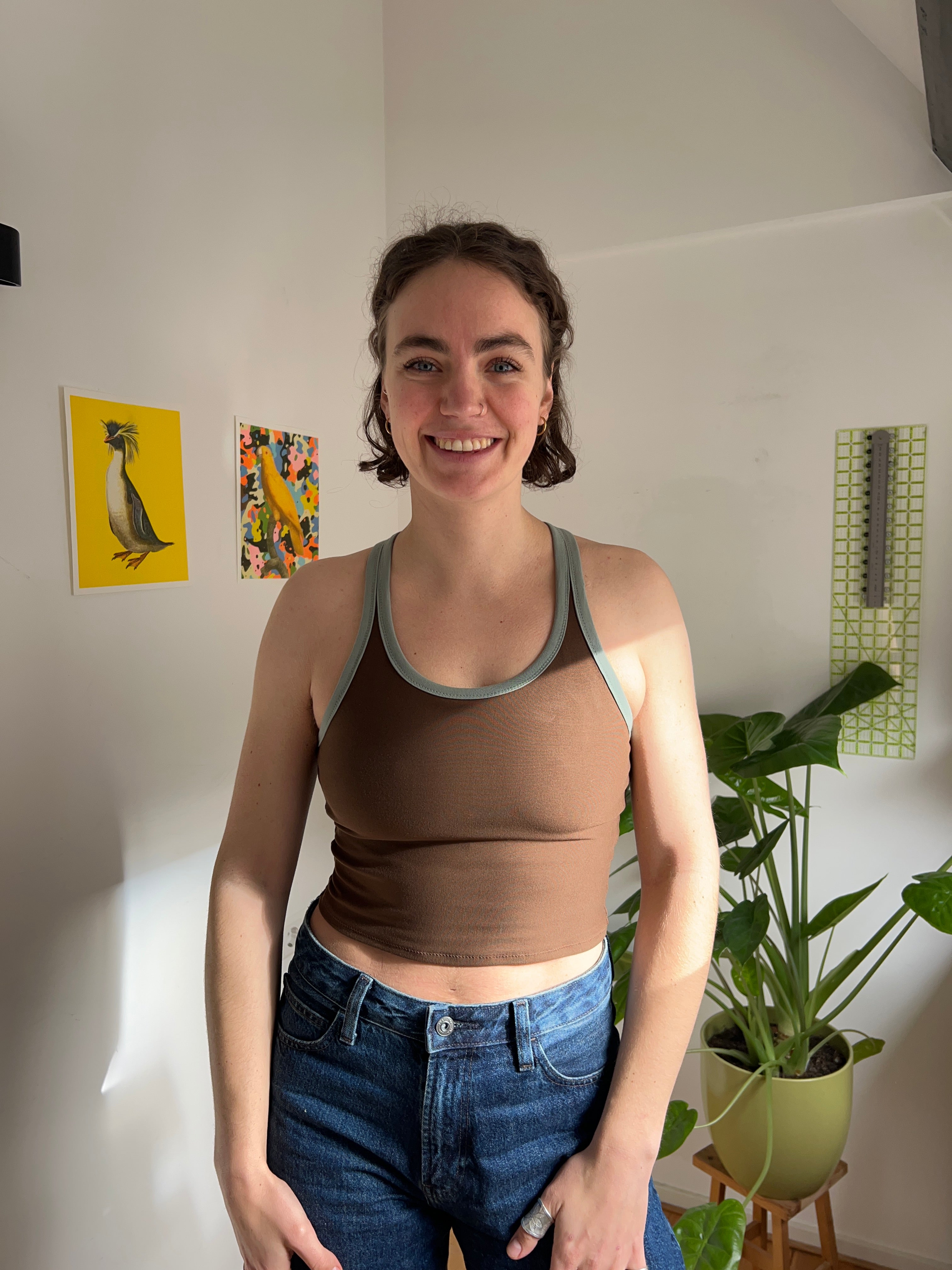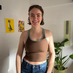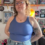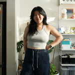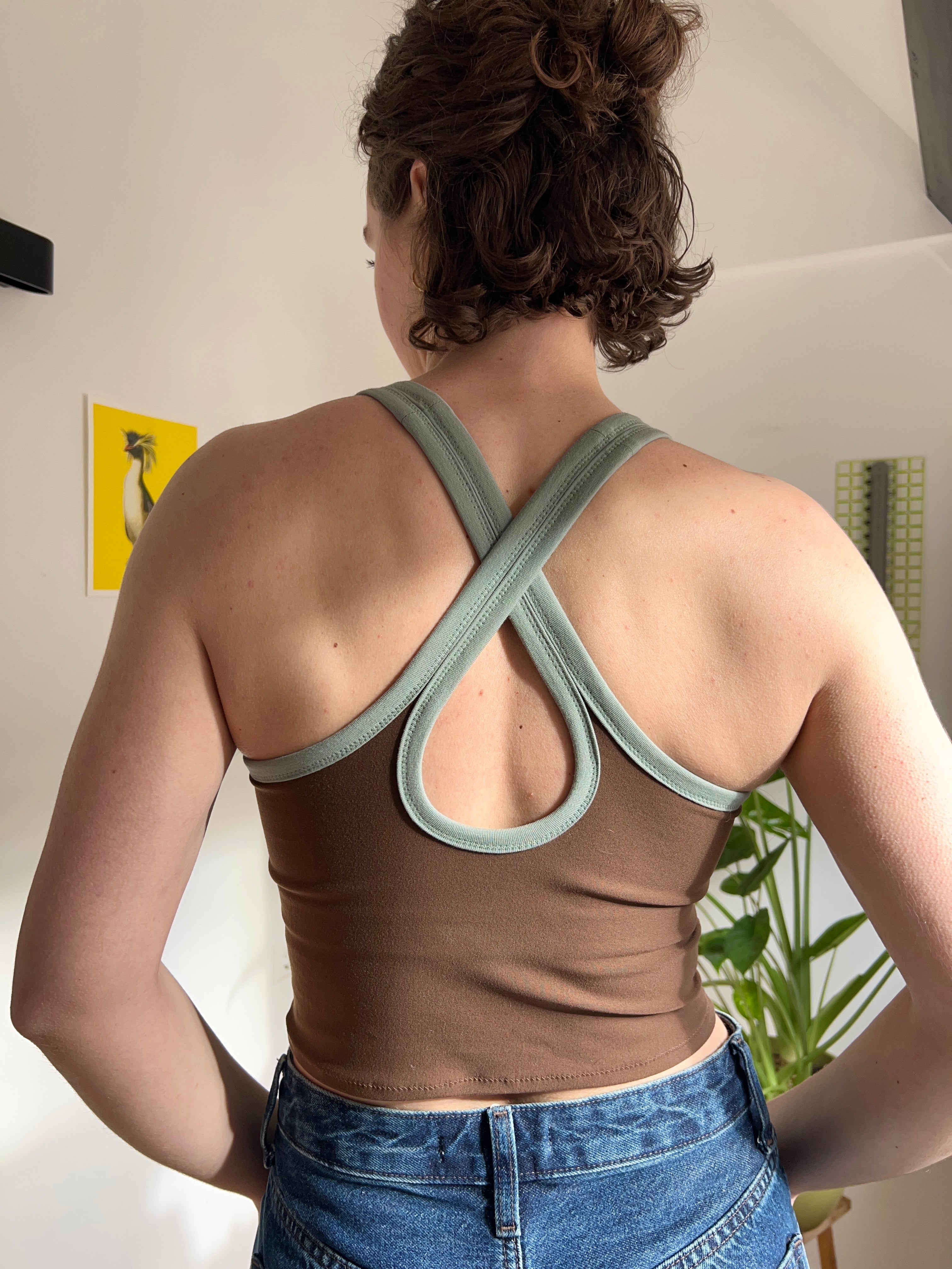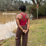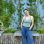 A fitted tank top with a cross-back strap design and continuous binding at the neckline and straps. It includes a built-in bra and comes in 2 lengths, Cropped or Full Length. Depending on fabric choice, this pattern works well for loungewear, everyday wear, or activewear.