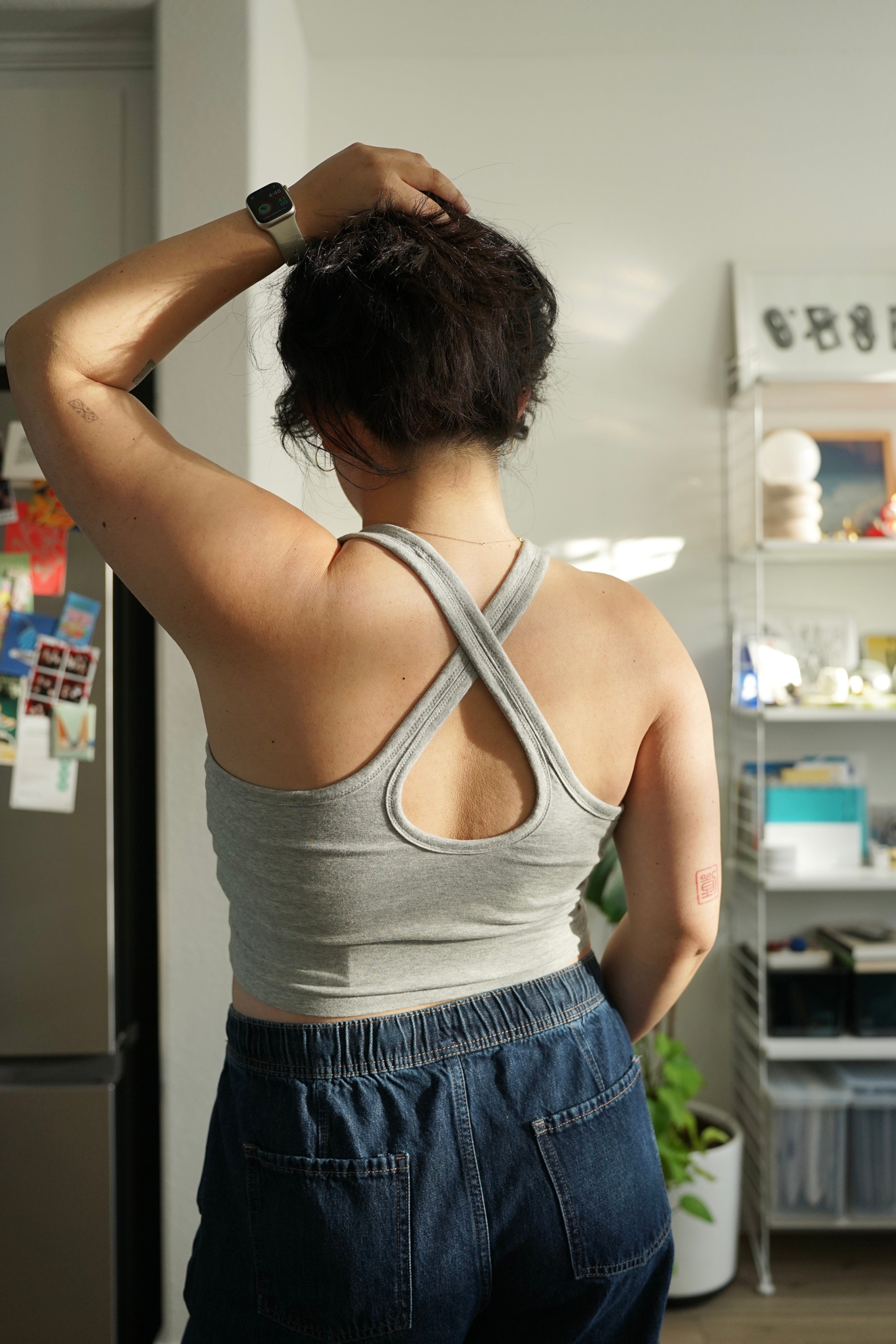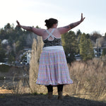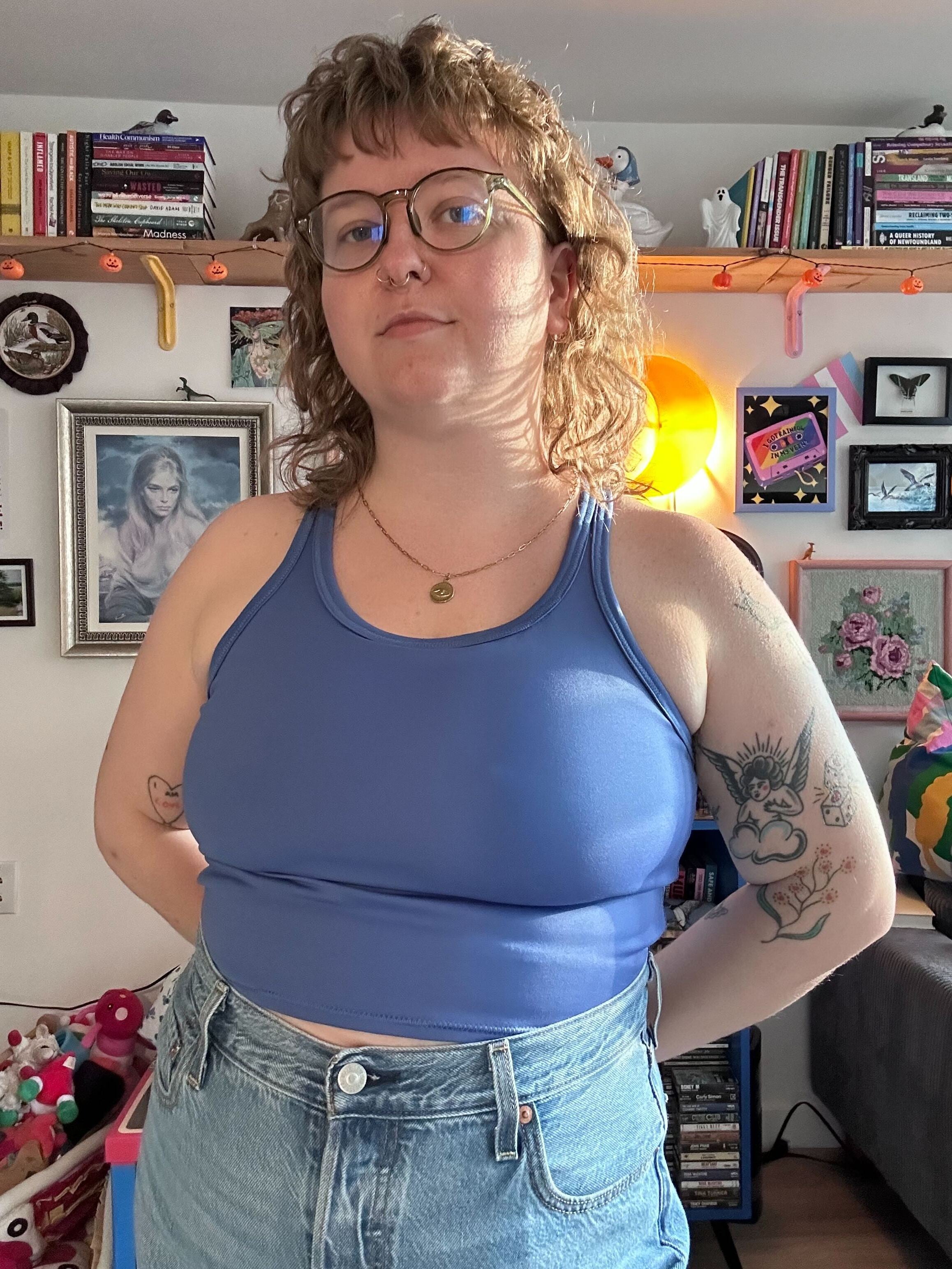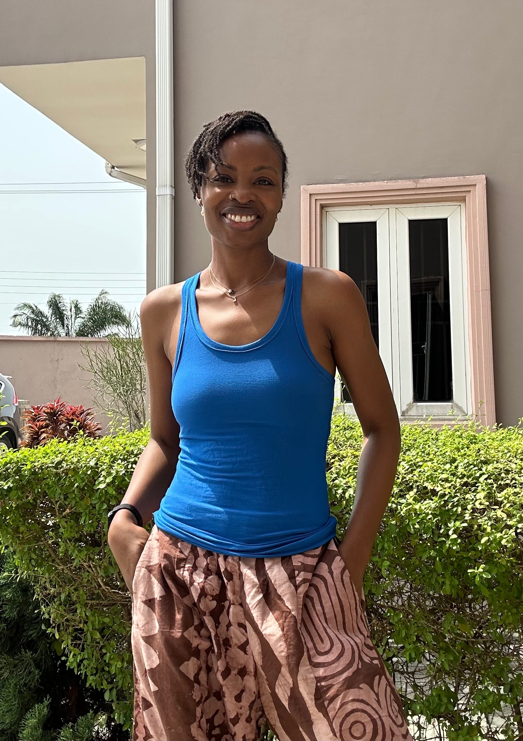 A fitted tank top with a cross-back strap design and continuous binding at the neckline and straps. It includes a built-in bra and comes in 2 lengths, Cropped or Full Length. Depending on fabric choice, this pattern works well for loungewear, everyday wear, or activewear.